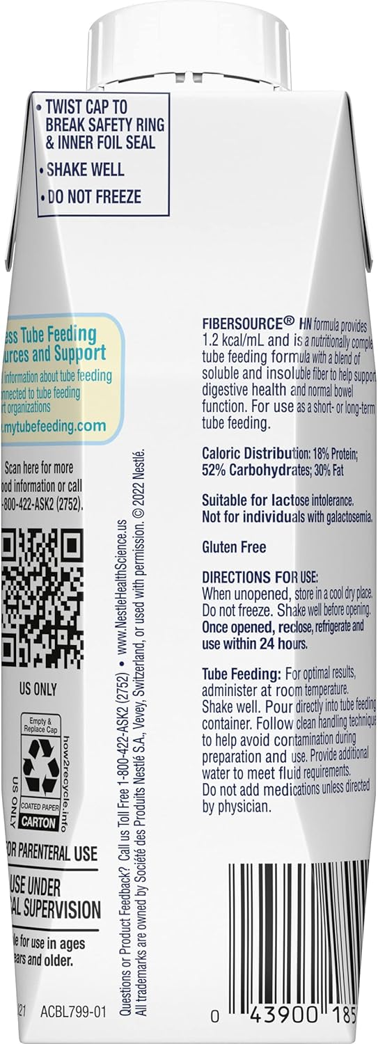 Nutritionally Complete Liquid Formula with Fiber. Fibersource® HN is a nutritionally complete tube feeding formula with fiber. It provides 1.2 calories per mL, 54 grams of protein, and 15.2 grams of fiber per liter.