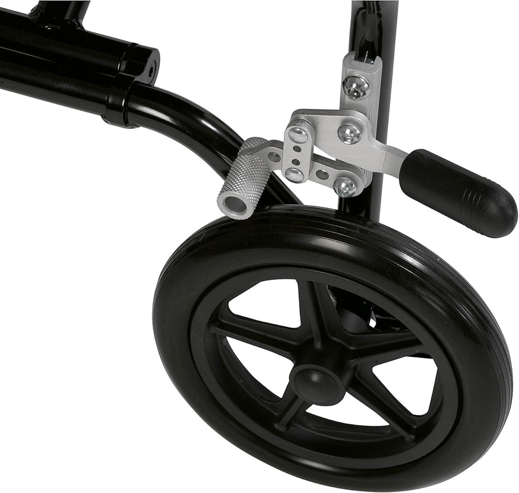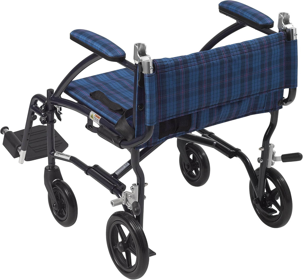 The Drive Medical 19" Fly Lite Ultra Lightweight aluminum transport chair proves that a lightweight, foldable transport wheelchair can be well made and a joy to use. Its smooth wheels maneuver across indoor and outdoor terrain, while easy-to-use brakes lock securely for safety. At just 16.2 pounds without riggings, these lightweight, folding wheelchairs for adults quickly and easily fold down to a small size to store in the trunk or back seat, making them great travel wheelchairs. Featuring a stylish blue aluminum frame and blue plaid nylon upholstery, the lightweight wheelchair is durable and easy to clean with a mild soap solution. The transport chair comes with a 19-inch seat, a carry pocket on the backrest, a seat belt for added safety, and tool-free, height-adjustable swing-away footrests. Backed by a limited lifetime warranty from Drive Medical, a leading brand of mobility aids and other medical goods for more than 20 years, you can purchase with confidence.