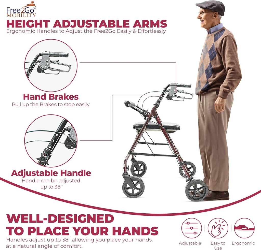• ROLLATOR WALKER WITH SEAT - Designed to restore your independence and dignity everywhere you go, the Free2Go is the ideal solution for individuals with mobility concerns such as seniors, the disabled and the handicapped. This 4 wheel, stand up walker with seat and brakes is a cost-effective way to improve your quality of life and make travelling safer and more fun. Enjoy and maintain an active social life while reducing the fear of falling. With Free2Go, you can enjoy life on your terms!
