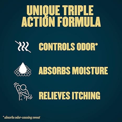 • Triple action formula absorbs odor causing sweat, controls odor and relieves itch