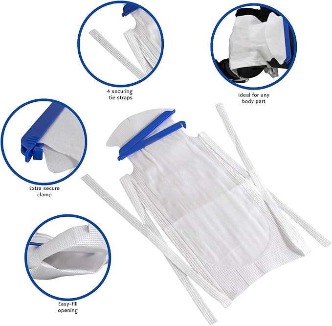 • 4 SECURING TIE STRAPS - Each bag has four conveniently located straps, 2 on the top and 2 on the bottom of the bag, to tie and secure the ice bag around arms, legs, elbows and knees. Straps help keep the ice pack in place, reducing slipping and sliding, allowing for an easier recovery.
