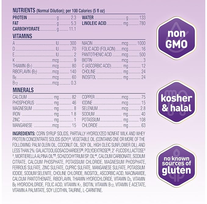Corn syrup solids, vegetable oil (palm olein, coconut, soy and high oleic sunflower oils), partially hydrolyzed nonfat milk and whey protein concentrate solids (soy), whey protein-lipid concentrate (milk) and less than 2%: Mortierella alpina oil, Schizochytrium sp. oil, calcium carbonate, sodium citrate, calcium phosphate, potassium chloride, magnesium phosphate, ferrous sulfate, zinc sulfate, cupric sulfate, manganese sulfate, potassium iodide, sodium selenite, choline chloride, inositol, ascorbic acid, niacinamide, calcium pantothenate, riboflavin, thiamin hydrochloride, vitamin D3, vitamin B6 hydrochloride, folic acid, vitamin K1, biotin, vitamin B12, vitamin E acetate, vitamin A palmitate, taurine, L-carnitine
