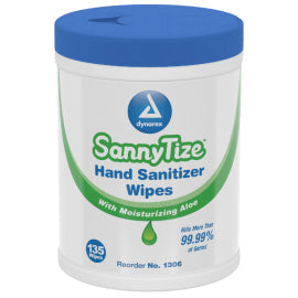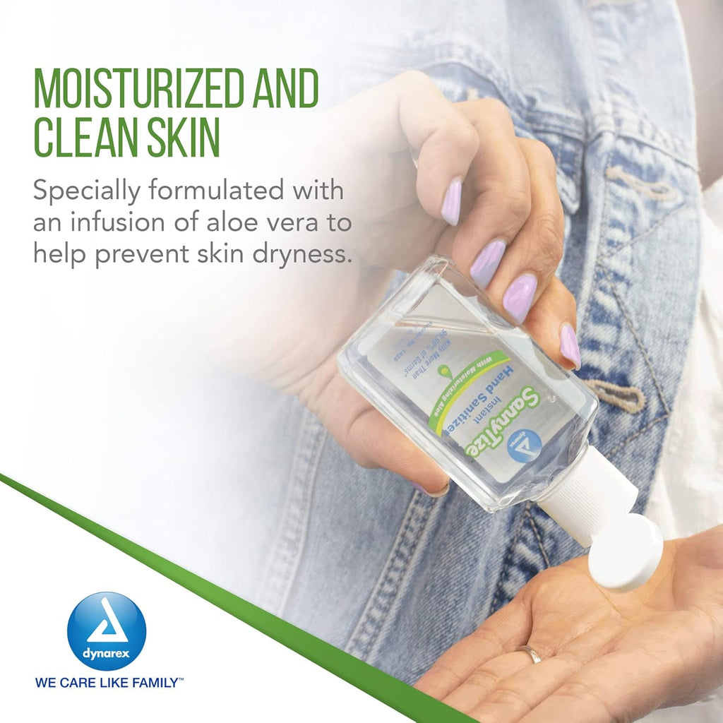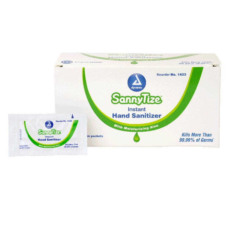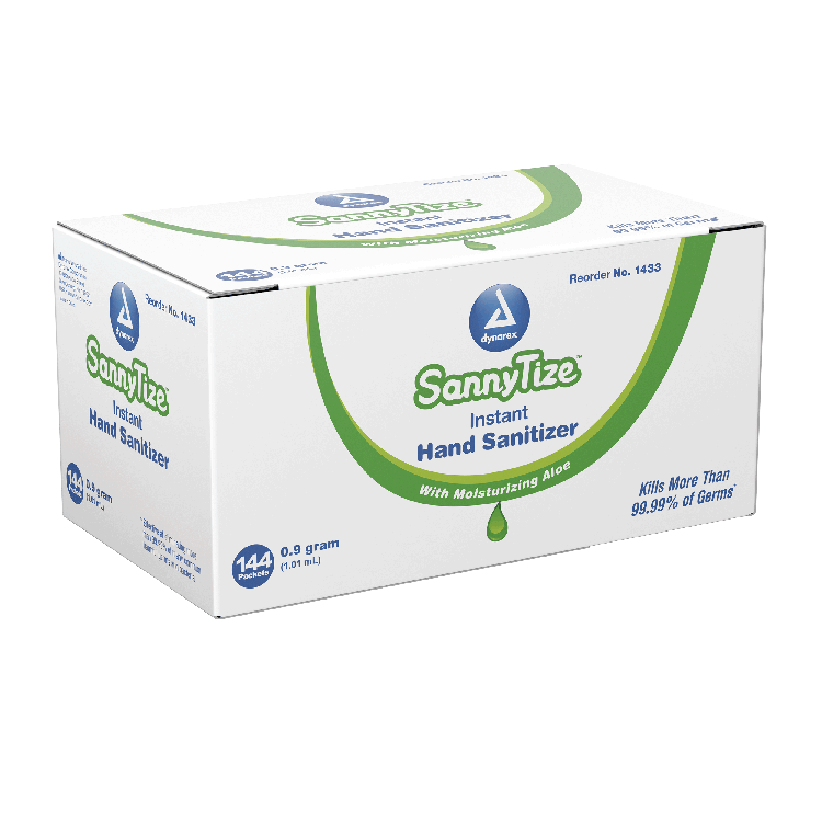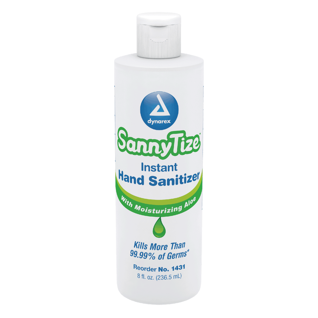 Dynarex DynaSafety Hand Sanitizer products are designed to eliminate more than 99% of germs and bacteria. The alcohol-based liquid formula evaporates quickly for optimal convenience on the go. The Hand Sanitizer features a moisturizing formula infused with aloe to help soothe skin for improved comfort. Dynarex Sannytize products are available in multiple varieties, including pump bottles, individually wrapped packets, soft packs, and canisters.Â