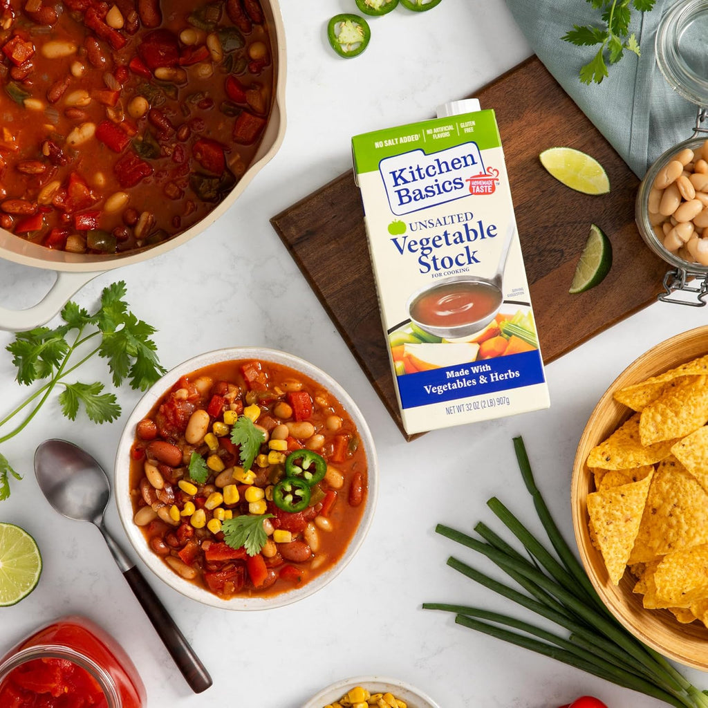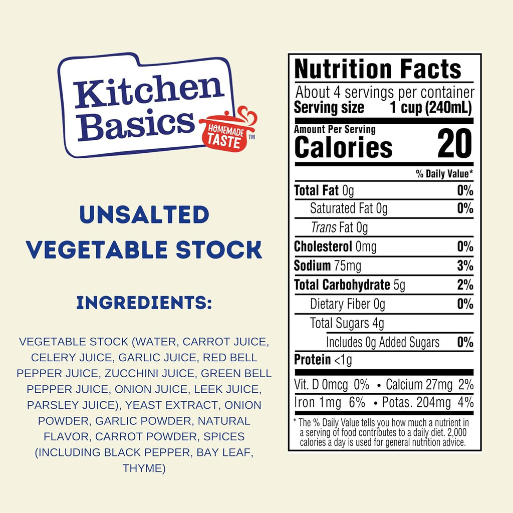 Kitchen basics unsalted vegetable stock contains no added salt and msg. Of natural salt per serving. Every 32 oz. Package of kitchen basics unsalted vegetable stock is free of gluten and 0 g. Of fat and cholesterol. Every 1-cup serving of unsalted vegetable stock provides 10% of the daily recommended value of vitamin a and contains just 4 g. Of sugar and 25 calories.