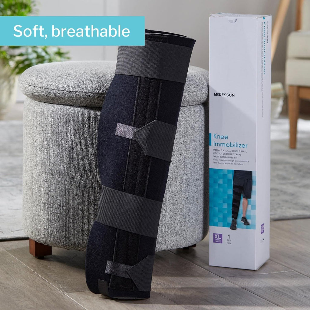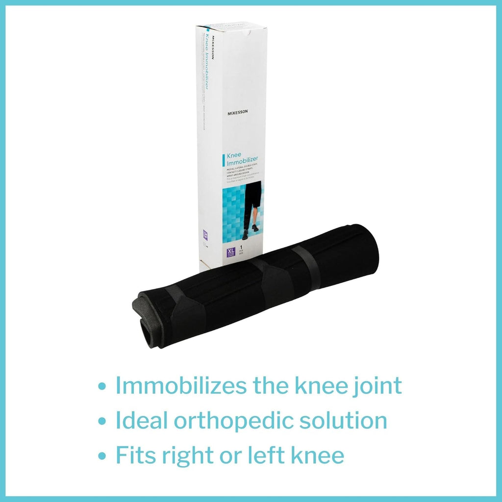 McKesson Knee Immobilizer is an orthopedic support designed for immobilization of the knee joint and fits either the left or right knee. The X-Large size accommodates patients with a thigh circumference up to 36 inches and features a 24-inch length. It is constructed with soft, breathable foam laminate and includes adjustable medial/lateral stays and rigid posterior stays for stability. Elastic contact closure straps and a wraparound design allow easy application, adjustment, and proper fit during use.