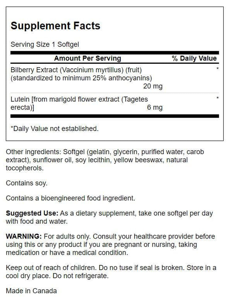 The sensitive tissues of the eyes are particularly vulnerable to the ravages of free radicals. That's why antioxidants play such important roles in maintaining eye health. Swanson Lutein & Bilberry combines two of nature's most effective eye- specific antioxidants to help maintain healthy vision. Each softgel provides 20 mg of standardized bilberry extract and 6 mg of lutein. For greater vision protection, pair bilberry and lutein supplements with Swanson Ultra Zeaxanthin , a carotenoid that offers demonstrated health benefits to the macula and lens of the eye.