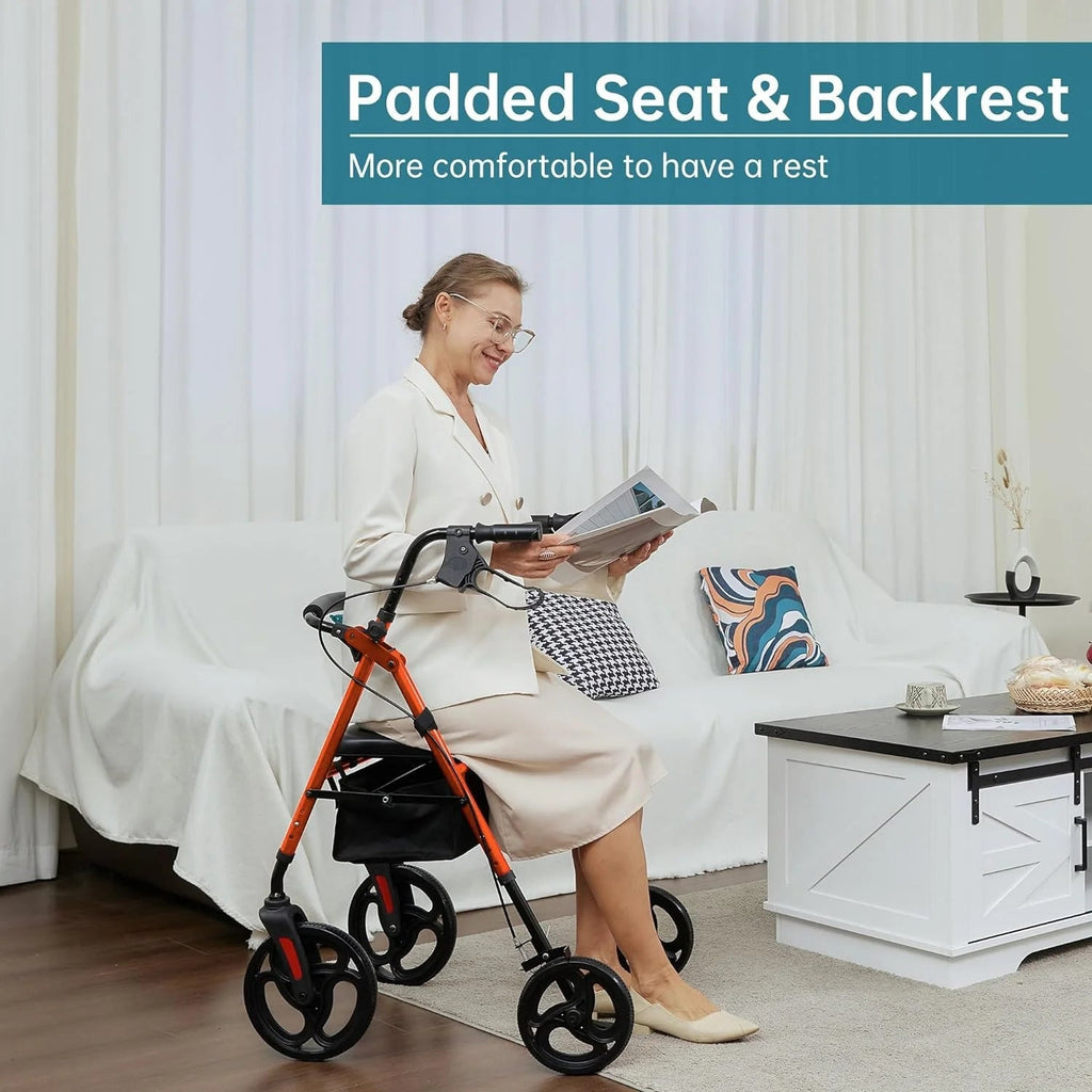 Elenker Rollator Walker with 10-inch front wheels and 8-inch rear wheels, foldable and removable back support. It continues to lead the way in design, quality and value. This wheeled walker comes with a padded backrest. It also comes with a comfortable seat and a convenient bag where you can store your personal belongings. 10-inch front and 8-inch rear casters are ideal for indoor and outdoor use. Ergonomic handle that adjusts to your height. With the Rollator Walker as your travel companion, you don't need to overstretch yourself, as this Rollator combines the functions of a comfortable and popular chair, giving you the opportunity to rest and refresh yourself anytime, anywhere.