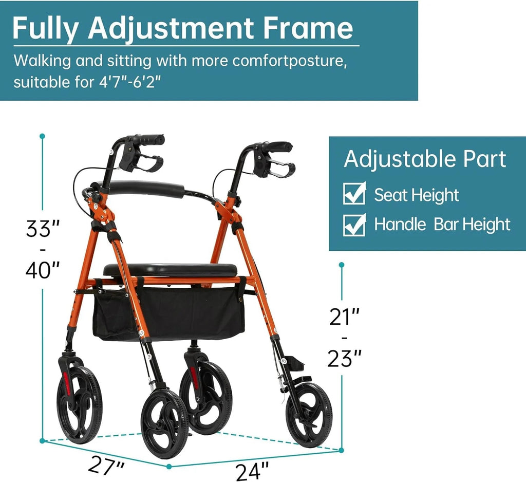 • Fully Adjustment Frame: Customize rollator with adjustable height handle bars and seat for walking and sitting with more comfort posture, suitable for 4’7” to 6’2”.