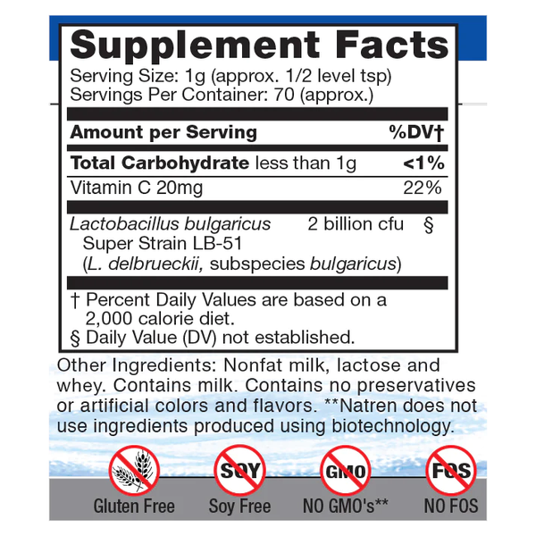 Answer: Natren digesta; lac description: in the healthy trinity system viable super strain beneficial bacteria l. Bulgaricus in maximize digestion, absorption and regularity lactobacillus bulgaricus, lb; lac works to support your resident flora and aid in digestion: may diminish the need for laxatives and promote regularity by stimulating peristaltic action. Produce lactase, which aids in the natural digestion of lactose (milk sugar) and may minimize lactose intolerance. Encourages an acidic ph level, inhibiting undesirable microorganisms and yeast. Promotes healthy immunity. Helps to improve the bioavailability and absorption of required minerals, especially calcium. Promotes protein digestion necessary for cellular repair. Free of preservatives, artificial colors and flavors. Disclaimer these statements have not been evaluated by the fda. These products are not intended to diagnose, treat, cure, or prevent any disease. Digestion of carbohydrates and proteins* Optimized digestion* A slightly acidic environment necessary for intestinal health* Helps growth of beneficial bacteria, L. acidophilus and B. bifidum* Digestion of dairy products by assisting with lactose metabolism* Digesta; Lac Step Three in Natren's three; step custom precision probiotic system to aid digestion naturally and optimally. If he loves his steaks and burgers this probiotic helps the stomach and gut digest the protein to build muscle and strength. It is the original longevity probiotic. If you need a probiotic bacteria to help you predigest your food this is the one. DIGESTA; LAC CAN SUPPORT: • Optimizing immune function* • Optimal digestive regularity* • Acidic environment necessary for intestinal health* • Growth of beneficial bacteria,  L. acidophilus  and  B. bifidum * • Digestion of dairy products by assisting with lactose metabolism* NATURAL INGREDIENTS TO HELP FLUSH OUT YOUR GI TRACT This Lactobacillus bulgaricus  probiotic supplement provides support throughout the digestion process*. Natren's Lactobacillus bulgaricus , LB