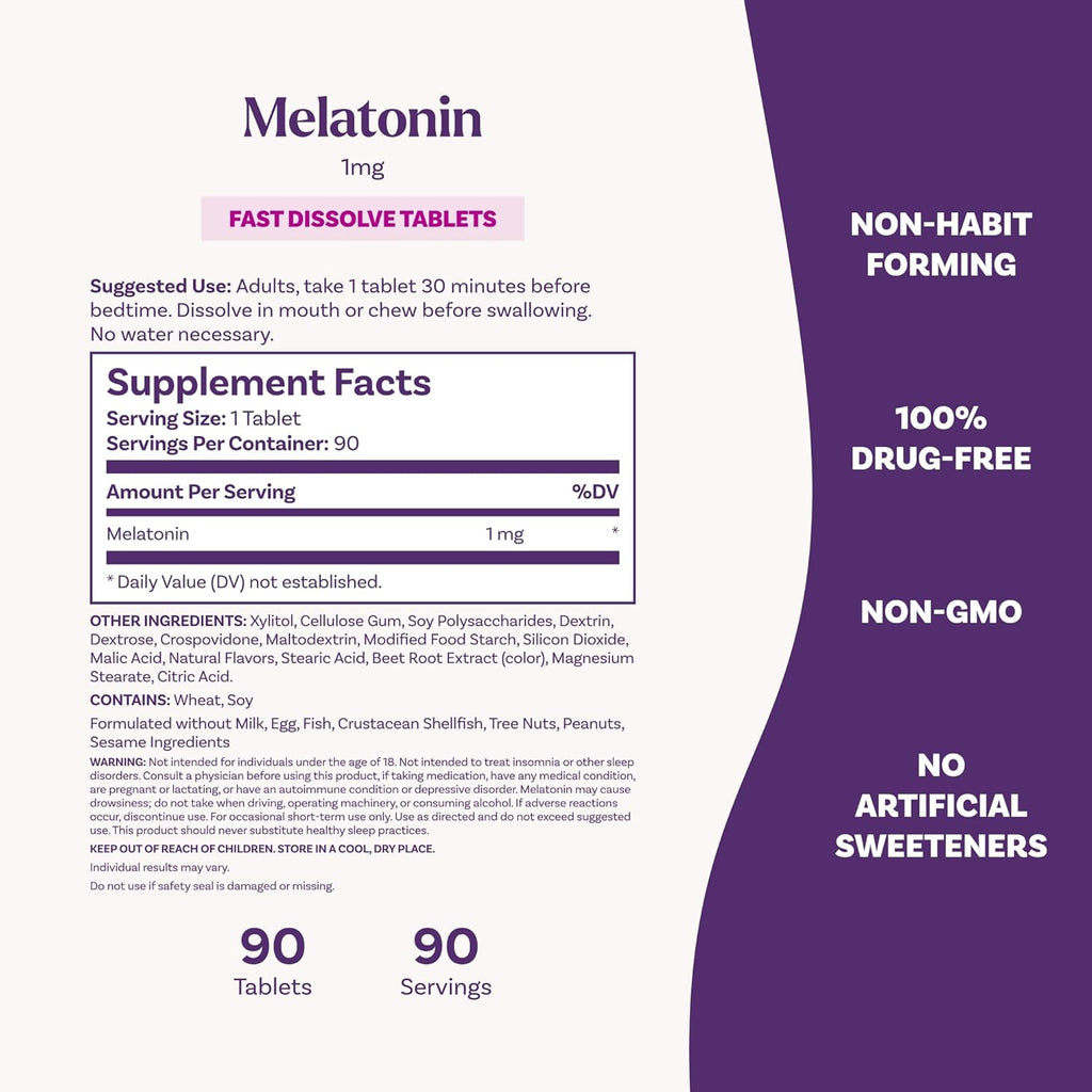 Natrol Fast Dissolve Melatonin 1 mg tablets are sleep support for adults that offer a convenient and easy-to-take option to help with occasional sleeplessness.(1) This adult melatonin nighttime sleep aid supplement is 100% drug-free, and non-habit forming. Natrol melatonin supplements for sleeping offer 1 mg of melatonin per serving, providing the sleep support you need to fall asleep faster and stay asleep longer.(1) Natrol Melatonin fast dissolve tablets promote sleep in as little as 15 minutes.(1) Natrol's fast dissolving, vegetarian sleep supplements formula with great-tasting strawberry flavor make these sleep aid tablets convenient to take before bed. Suggested Use: Adults, take one melatonin 1 mg fast dissolve tablet 30 minutes before bedtime. Dissolve in mouth or chew before swallowing. No water necessary. Natrol is dedicated to creating innovative, quality products, to help you maintain good health and thrive in your busy, modern lifestyle. (1)These statements have not been evaluated by the Food and drug administration. This product is not intended to diagnose, treat, cure or prevent any disease. (2)Nielsen, xAOC, 52 weeks ending 8/24/24, Sleep Aid Supplements