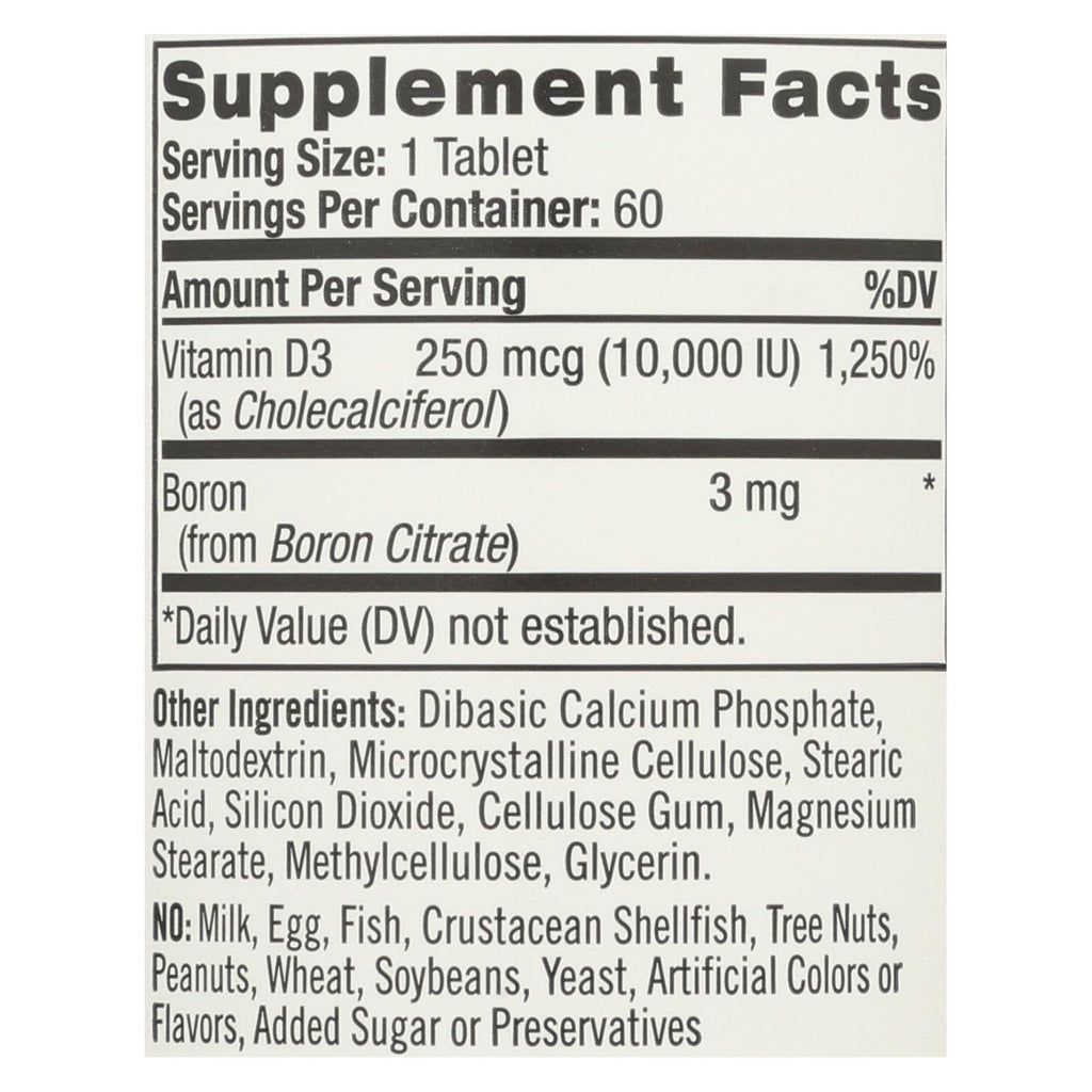 Natrol vitamin d3 bone & joint health dietary supplement provides a full 10,000 iu of vitamin d3 in every softgel to help quickly restore low vitamin d3 levels. Vitamin d3 is essential for bone health, and we make this vitamin d3 supplement without artificial colors or flavors. This bottle holds 60 softgels of maximum strength vitamin d3 supplement with added boron.