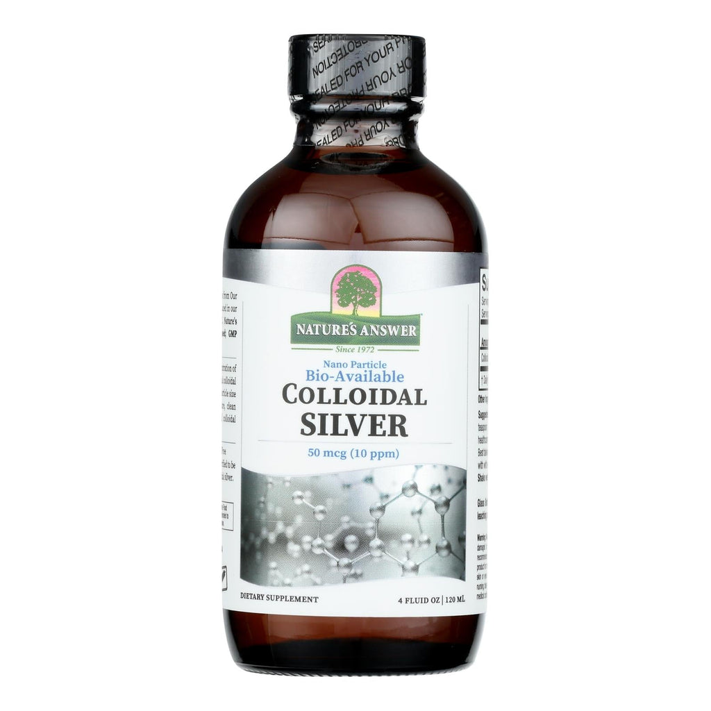 Dietary supplement. Soy free. Dairy free. Gluten free. Non-gmo. Since 1972. Nano particle. Bio-available. 50 mcg (10 ppm). Nature's answer offering the finest supplements from our family to yours, since 1972. Colloidal silver produced in our family owned manufacturing facility. Nature's answer manufacturing facility is: usa based; gmp compliant; nsf registered. Nature's answer colloidal silver features a concentration of 10 ppm (parts per million) of high quality elemental colloidal silver, which offers the advantage of ultra small particle size to support easy absorption and excretion. Pure, clean formula featuring only high quality elemental colloidal silver and purified water. Nature's answer colloidal silver particle size are verified to be in the nano rage size making it a true nano size colloidal silver. Glass bottles - protect the silver solution from plastic leaching and degradation. Www.naturesanswer.com. For product information, call (800) 439-2324. (this statement has not been evaluated by the food and drug administration. This product is not intended to diagnose, treat, cure, or prevent any disease.)