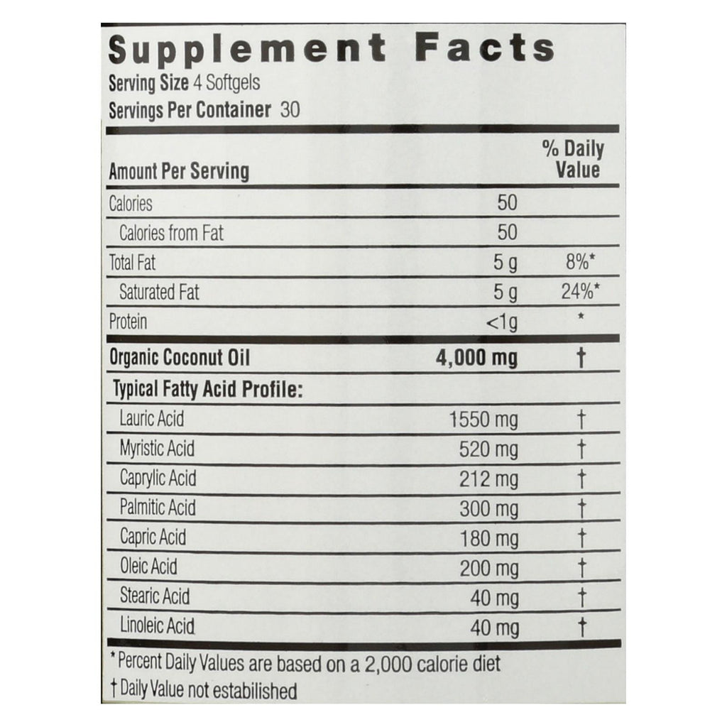 Nature's answer extra virgin coconut oil supplies your body with lauric acid, a beneficial fatty acid. Free of synthetic ingredients and providing an array of health benefits, take four soft gels daily with food or water to see the best results of these fatty acids. This bottle contains 120 soft gels of extra virgin coconut oil.