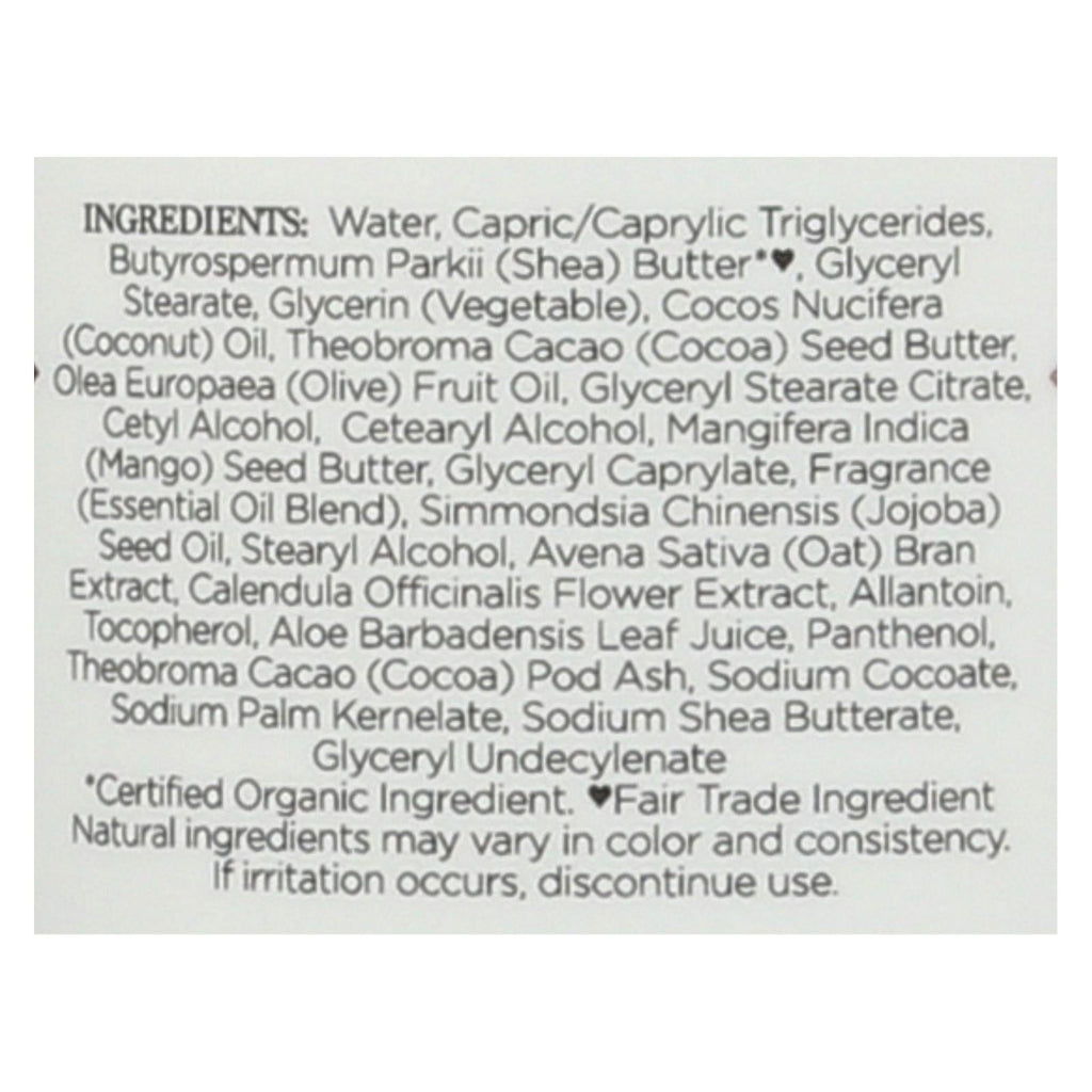 ingredients : water;capric/caprylic triglycerides;butyrospermum parkii;shea;butter*❤;glyceryl stearate;glycerin;vegetable;cocos nucifera;coconut;oil;theobroma cacao;cocoa;seed butter;olea europaea;olive;fruit oil;glyceryl stearate citrate;cetyl alcohol;cetearyl alcohol;mangifera indica;mango;glyceryl caprylate;fragrance;essential oil blend;simmondsia chinensis;jojoba;seed oil;stearyl alcohol;avena sativa;oat;bran extract;calendula officinalis flower extract;allantoin;tocopherol;aloe barbadensis leaf juice;pan