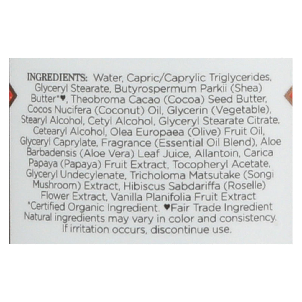 ingredients : water;capric/caprylic triglycerides;glyceryl stearate;butyrospermum parkii;shea;butter*♥;theobroma cacao;cocoa;seed butter;cocos nucifera;coconut;oil;glycerin;vegetable;stearyl alcohol;cetyl alcohol;glyceryl stearate citrate;cetearyl alcohol;olea europaea;olive;fruit oil;glyceryl caprylate;fragrance;essential oil blend;aloe barbadensis;aloe vera;leaf juice;allantoin;carica papaya;papaya;fruit extract;tocopheryl acetate;glyceryl undecylenate;tricholoma matsutake;songi mushroom;extract;hibiscus sa