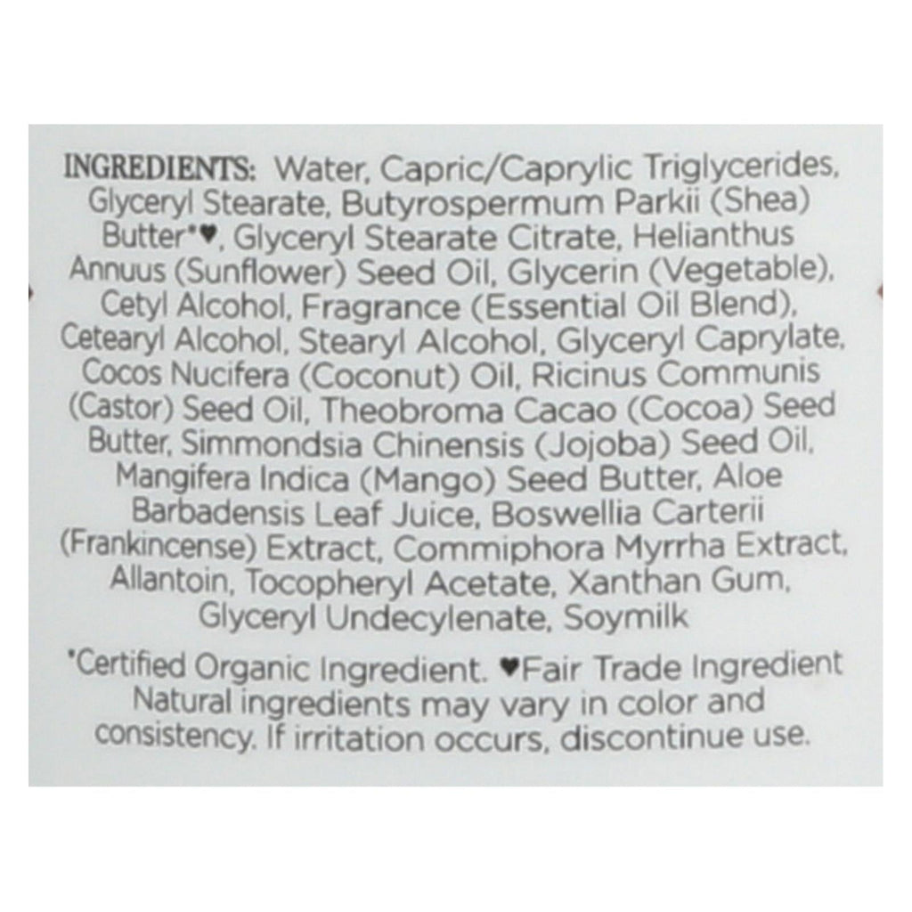 ingredients : water;capric/caprylic triglycerides;glyceryl stearate;butyrospermum parkii;shea;butter*♥;glyceryl stearate citrate;helianthus annuus;sunflower;seed oil;glycerin;vegetable;cetyl alcohol;fragrance;essential oil blend;cetearyl alcohol;stearyl alcohol;glyceryl caprylate;cocos nucifera;coconut;oil;ricinus communis;castor;theobroma cacao;cocoa;seed butter;simmondsia chinensis;jojoba;mangifera indica;mango;aloe barbadensis leaf juice;boswellia carterii;frankincense;extract;commiphora myrrha extract;all
