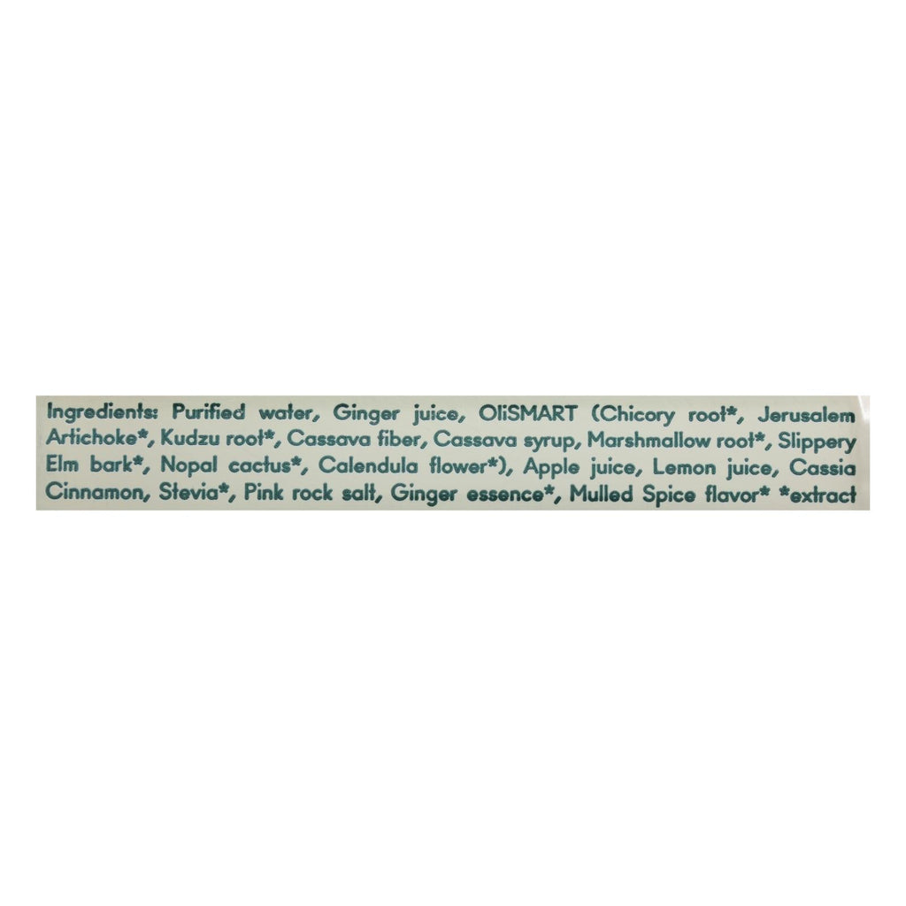 ingredients : purified wafer;ginger juice;olismart (chicory root*, jerusalem artichoke*, kudzu root*, cassava fiber, cassava syrup, marshmallow root*, slippery elm bark*, nopal cactus*, calendula flower*);apple juice;lemon juice;cassia cinnamon;stevia;pink rock salt;ginger essence;mulled spice flavor