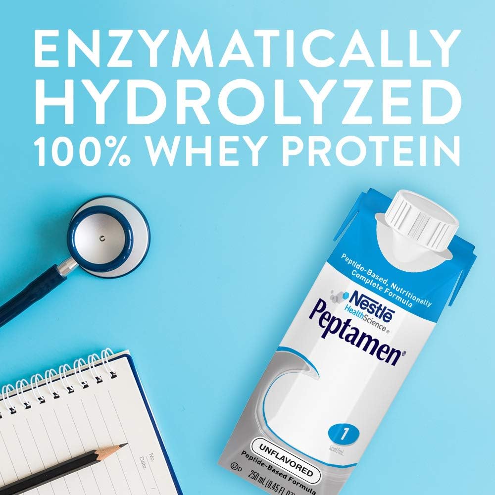 Peptamen formulas contain enzymatically hydrolyzed, 100% whey protein, which are associated with improved absorption and tolerance.
