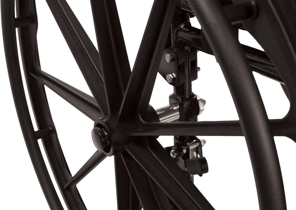 Answer: Manual wheelchairs usually have push to lock brakes on the rear wheels. Transport chairs often include attendant hand brakes with parking locks for safety during transfers or slopes.