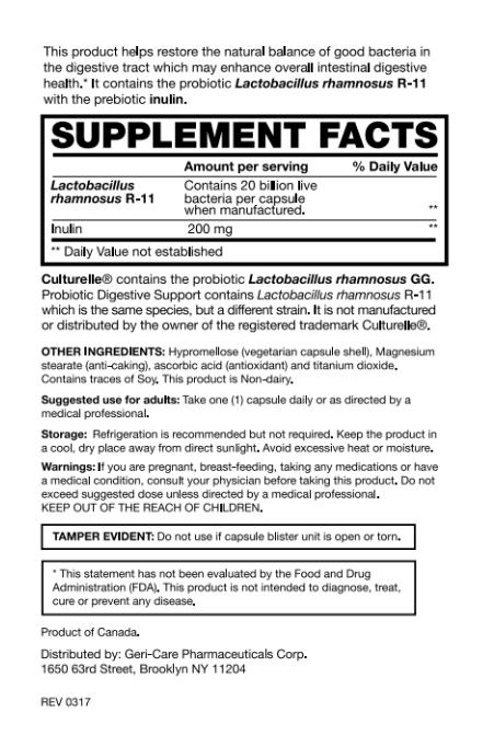 Answer: Probiotic Dietary Supplement Geri-Care 30 per Box Capsule, Packaging Type- Box is a fiber/digestive health supplement described in the product details.
