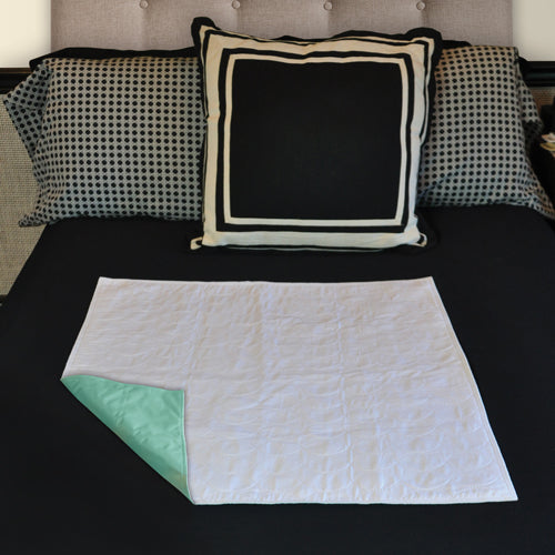 Answer: A protective bed pad that shields mattresses, chairs, or furniture from leaks and spills.