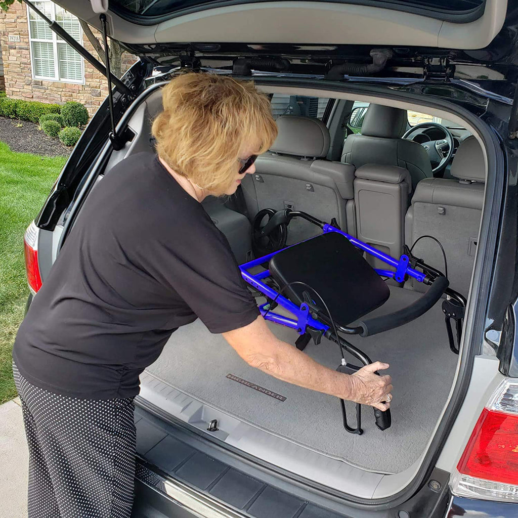 • LIGHTWEIGHT ADULT WALKER: This walker with wheels is made of aluminum and very lightweight. The walker is portable, and can be folded up easily for travel, storage, or for a Sunday drive. Seat and wheels are very durable and support 300 pounds or less.