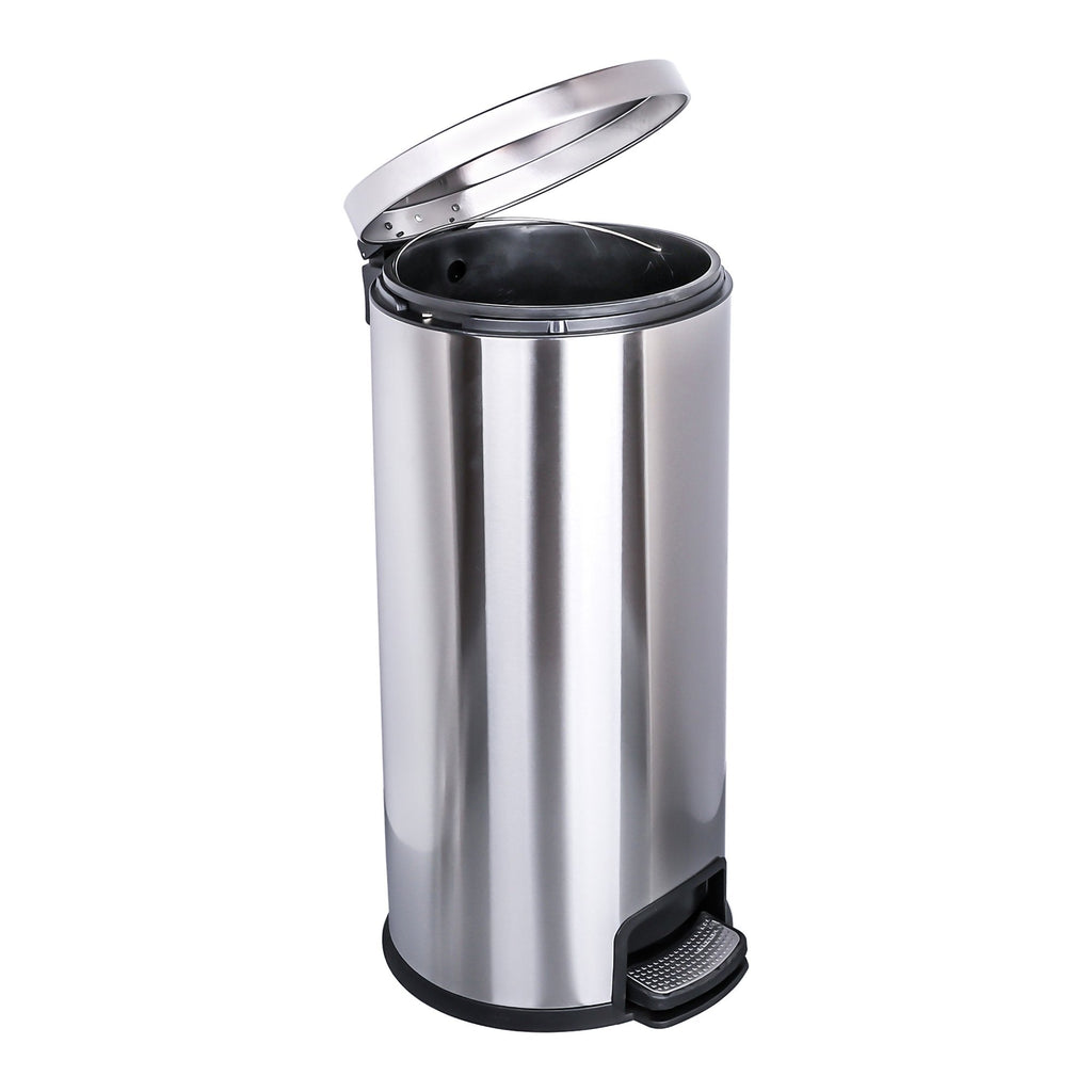 silver round trash can with a lid by McKessonPedal mechanism on McKesson steel garbage binClose-up of step-on pedal for McKesson binStep-on opener of stainless McKesson waste bin