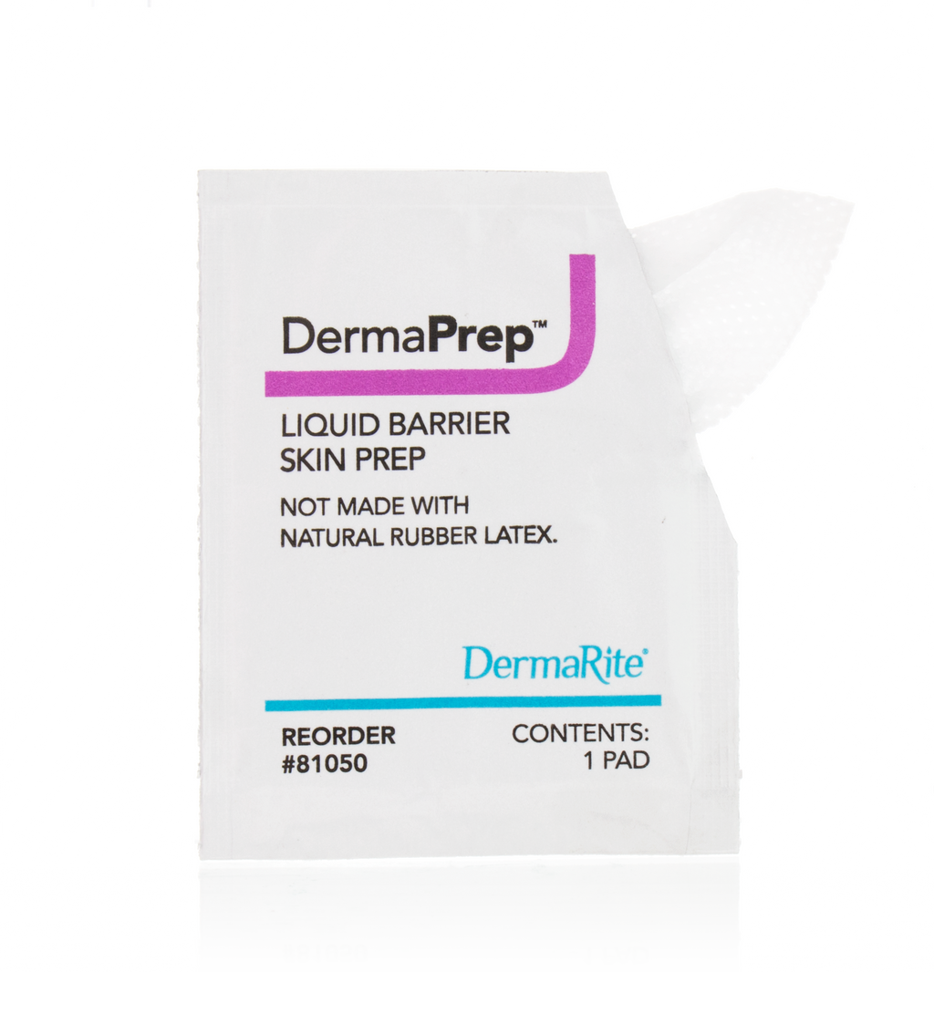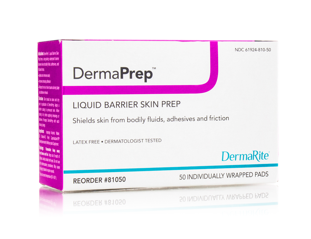 • DermaPrep Liquid Barrier Skin Protectant forms a long-lasting waterproof film designed to shield peri-wound skin from bodily fluids, adhesives, and frictional forces. It helps reduce the risk of pain and skin damage during tape and adhesive removal.