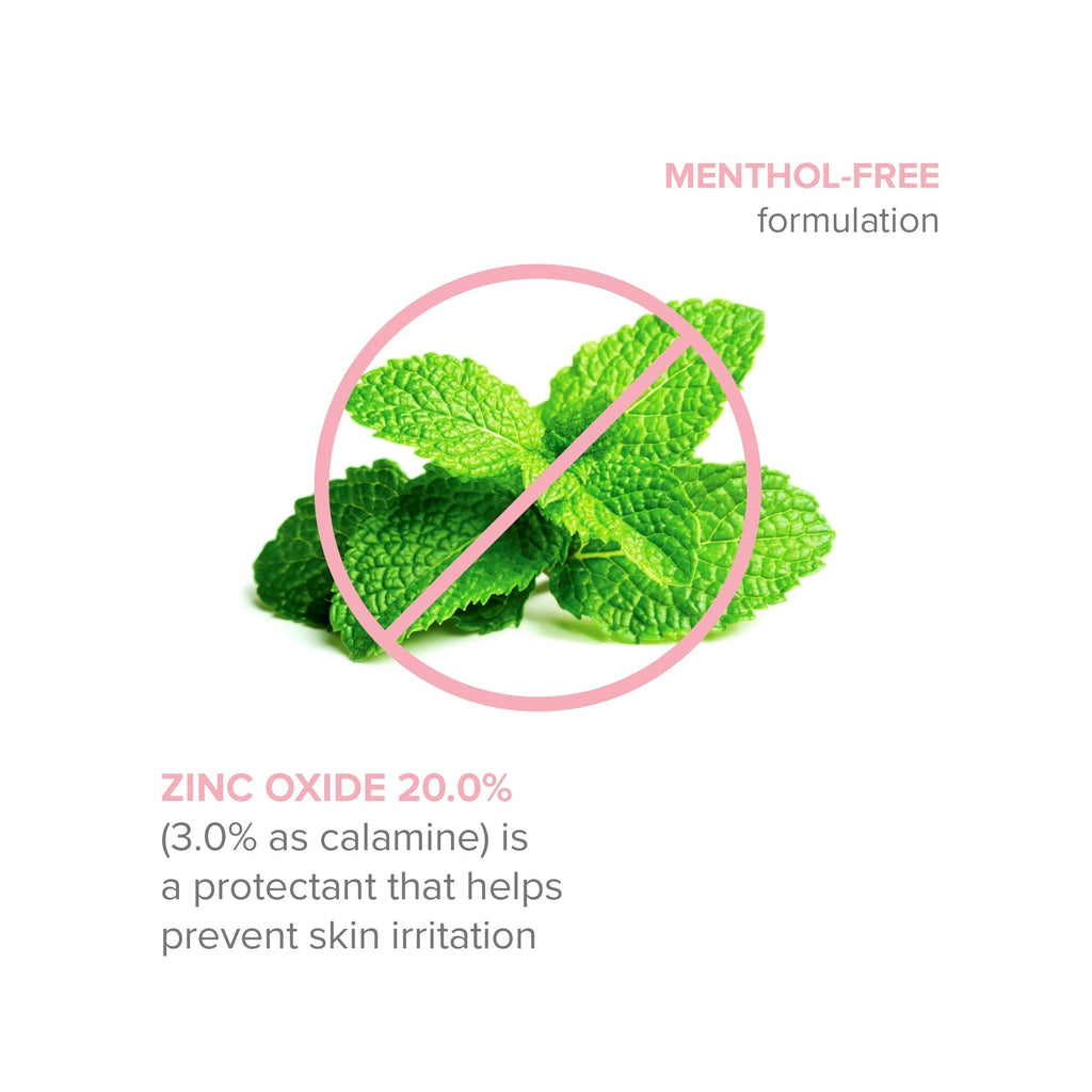• 20.0% zinc oxide and 3.0% calamine create a protective barrier
