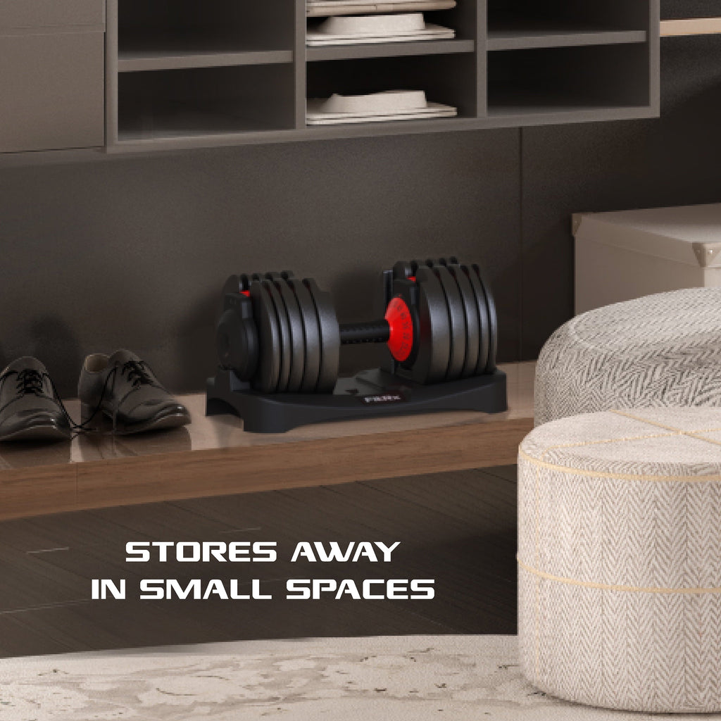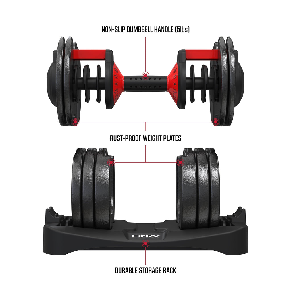 Maximize your strength training with minimal equipment using the FitRx SmartBell XL! This adjustable dumbbell lets you customize the SmartBell XL’s weight in increments ranging from 10 to 90 lbs. No need for a clunky dumbbell set of multiple dumbbells with this all-in-one adjustable weight. The simple one-handed, quick-select design makes it easier to use than other adjustable dumbbells: just grip the handle and rotate towards your desired weights. It also features an anti-slip handle and safety lock for a more secure and seamless workout. The space-saving design comes with a durable storage rack that fits perfectly anywhere in your home gym, and holds plates when they’re not in use. Increase the weight as your strength grows and get the exercise and fitness results you want with the FitRx SmartBell XL!