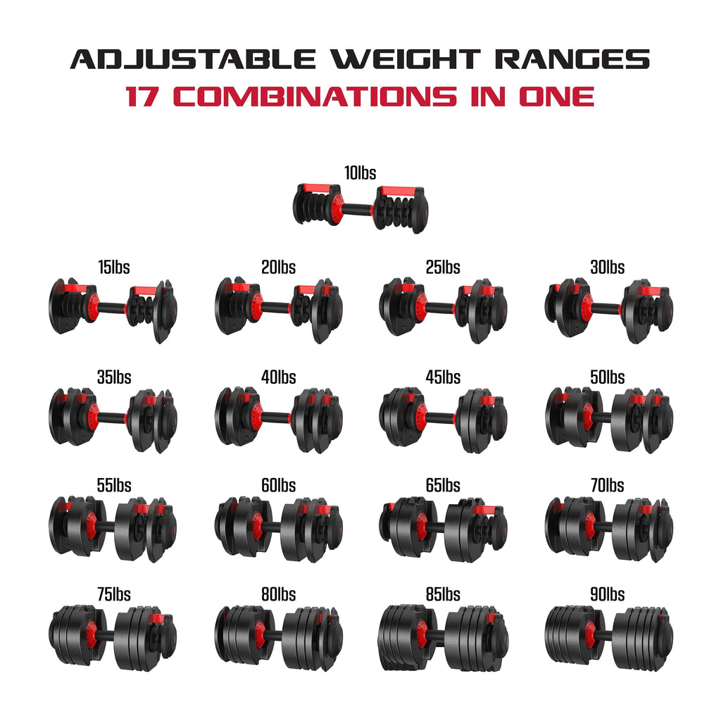 • 10 plates with 17 different weight configurations: 10, 15, 20, 25, 30, 35, 40, 45, 50, 55, 60, 65, 70, 75, 80, 85, and 90 lbs.