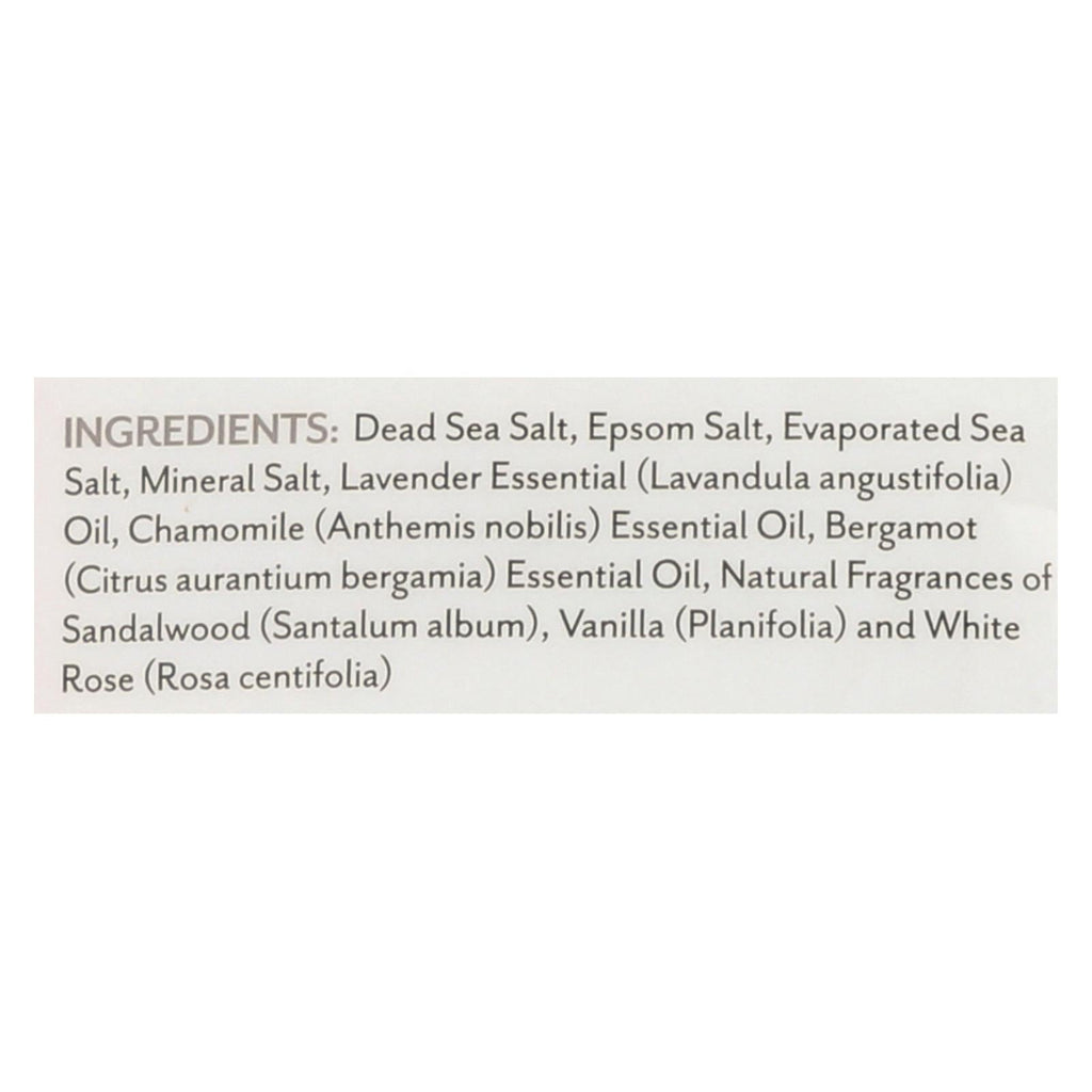 ingredients : dead sea salt;epsom salt;evaporated sea salt;mineral salt;lavender essential;lavandula angustifolia;oil;chamomile;anthemis nobilis;essential oil;bergamot;citrus aurantium bergamia;natural fragrances of sandalwood;santalum album;vanilla;planifolia;and white rose;rosa centifolia