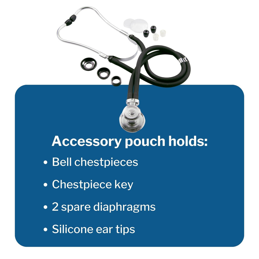 • Complete with an accessory pouch containing the bell chest pieces, chest piece key, two spare diaphragms, one pair of mushroom ear tips, and one pair of silicon ear tips