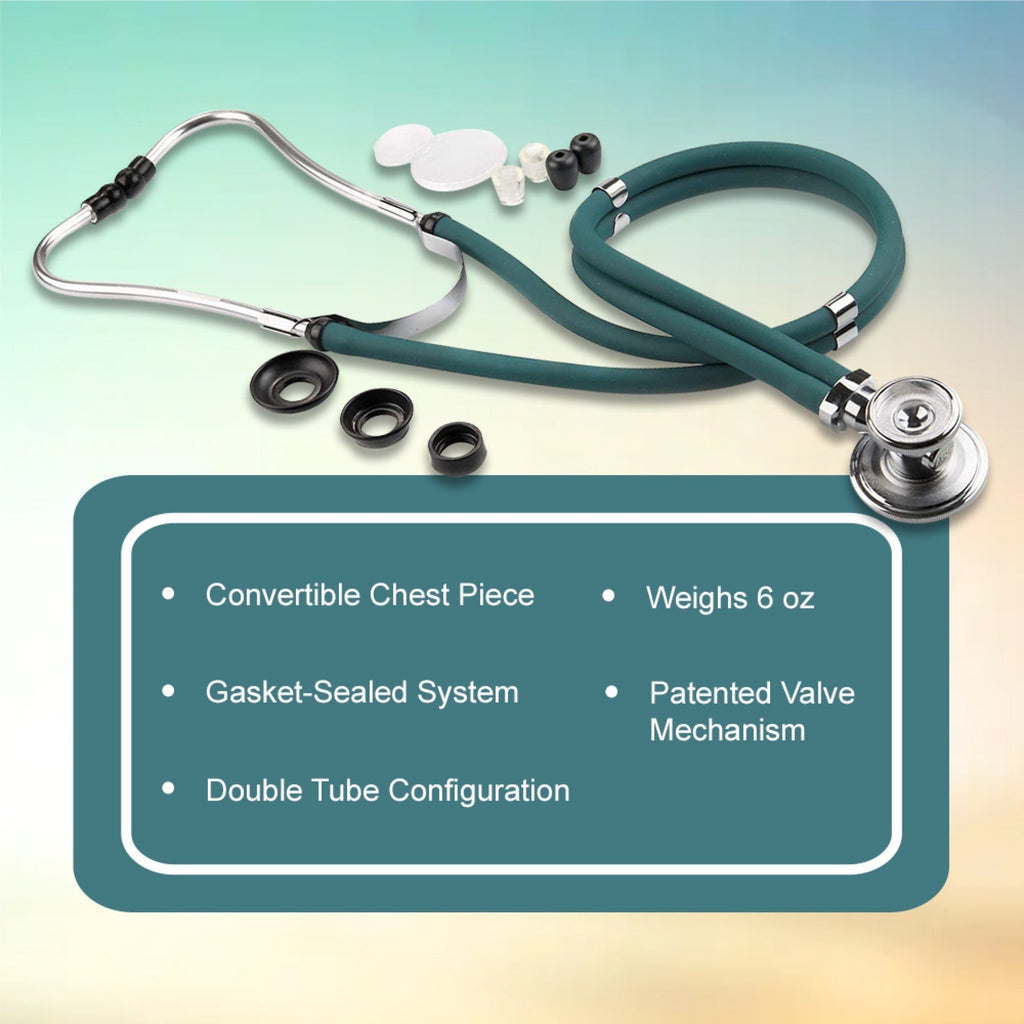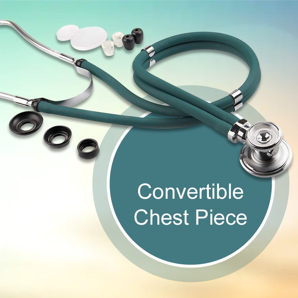 • Convertible chest piece permits the use of five interchangeable chest piece fittings -- an adult and pediatric diaphragm, and three bells (1-1/4 inch, 1 inch, 3/4 inch)