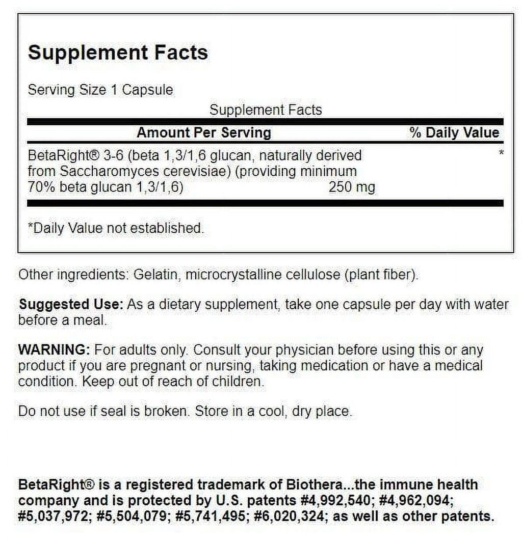 BetaRight 3-6 250 mg *,Other ingredients: Gelatin, microcrystalline cellulose (plant fiber), magnesium stearate, silica.,As a dietary supplement, take one capsule per day with water before a meal./div>