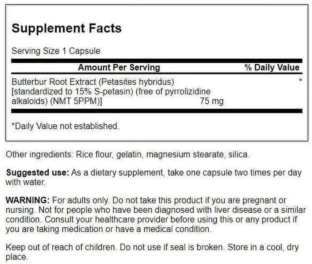 Butterbur Root Extract 75 mg *,Other ingredients: Rice flour, gelatin, may contain one or both of the following: magnesium stearate, silica.,As a dietary supplement, take one capsule two times per day with water.,Do not take this product if you are pregnant or nursing./div>
