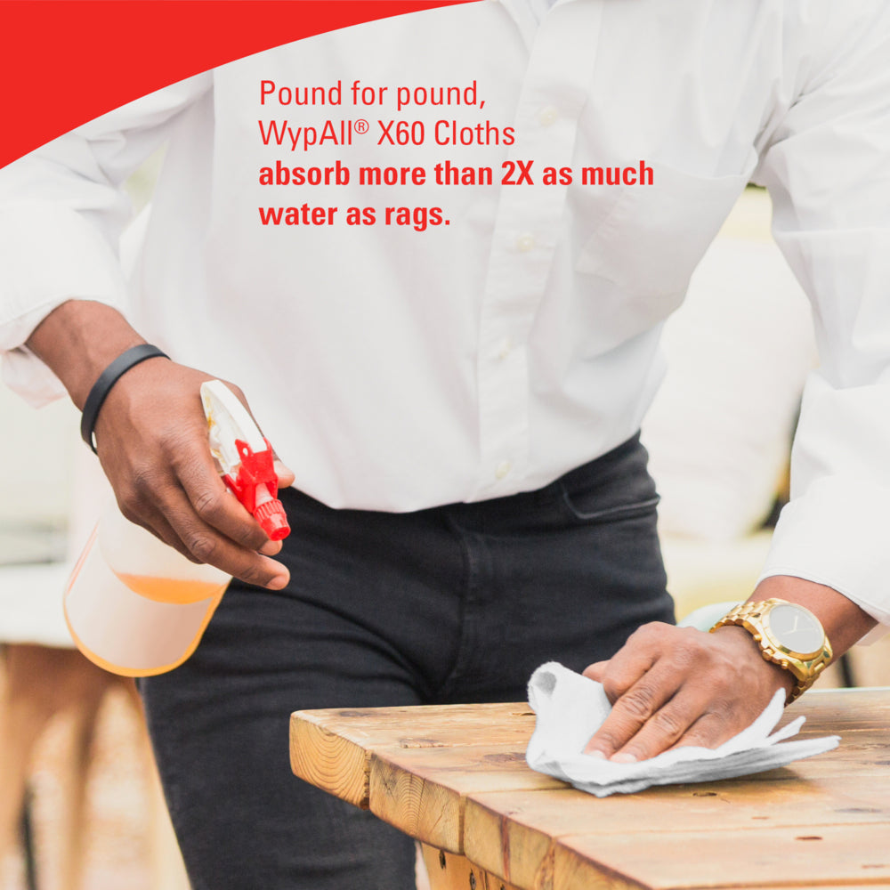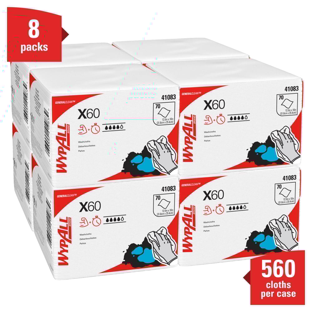 • WypAll® is the number one brand of disposable wipes in the US and Canada. Create a clean work environment with light to medium duty general cleaning solutions. You can trust WypAll® General Clean X60 Multi-Task Cleaning Cloths-Washcloths for efficient cleaning. Pound for pound, WypAll® General Clean X60 Multi-Task Cleaning Cloths absorb more than two times as much water as rags. They bring the absorbing power of HydroKnit technology (for superior absorbency) to a lighter-weight cloth. Designed to outperform laundered rags, WypAll® X60 Cloths help raise the standard for general-purpose cloths at a terrific value. They don’t use adhesives or binders, so they’ll leave no residue behind, and they’re reinforced for strength when wet or dry. These cleaning washcloths are so sturdy that they can often be used more than once (once you’ve used them a few times, they’re disposable). They’re designed to reduce waste so you spend less. When effectiveness and value top your list of criteria, you can trust WypAll® General Clean X60 Multi-Task Cleaning Cloths to deliver.