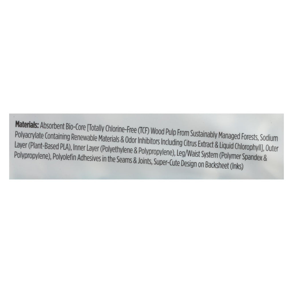 ingredients : absorbent bio-core [totally chlorine-free;tcf;wood pulp from sustainably managed forests;sodium polyacrylate containing renewable materials & odor inhibitors including citrus extract & liquid chlorophyll];outer layer;plant-based pla;inner layer;polyethylene & polypropylene;leg;/waist system;polymer spandex & polypropylene;polyolefin adhesives in the seams & joints;super-cute design on backsheet;inks