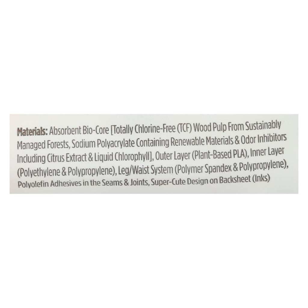 Ingredients : absorbent bio-core [totally chlorine-free (tcf) wood pulp from sustainably managed forests, sodium polyacrylate containing renewable materials & odor inhibitors including citrus extract & liquid chlorophyll];outer layer(plant-based pla);inner layer (polyethylene & polypropylene);leg/waist system (polymer spadex & polypropylene);polyolefin adhesives in the seams & joints;super-cute design on backsheet (inks)