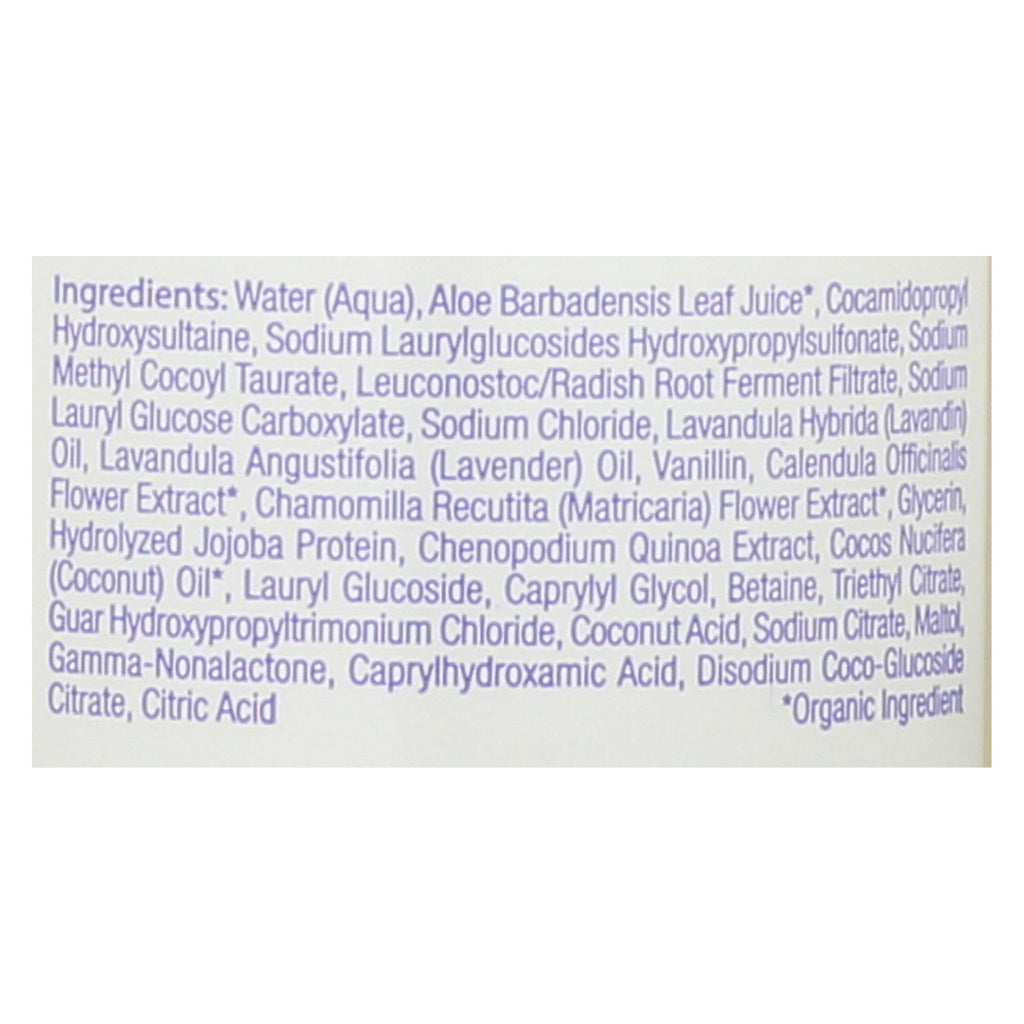 ingredients : water;aqua;aloe barbadensis leaf juice;cocamidopropyl hydroxysultaine;sodium laurylglucosides hydroxypropylsulfonate;sodium methyl cocoyl taurate;leuconostoc/radish root ferment filtrate;sodium lauryl glucose carboxylate;sodium chloride;lavandula hybrida;lavandin;oil;lavandula angustifolia;lavender;vanillin;calendula officinalis flower extract;chamomilla recutita;matricaria;flower extract;glycerin;hydrolyzed jojoba protein;chenopodium quinoa extract;cocos nucifera;coconut;lauryl glucoside;capryl