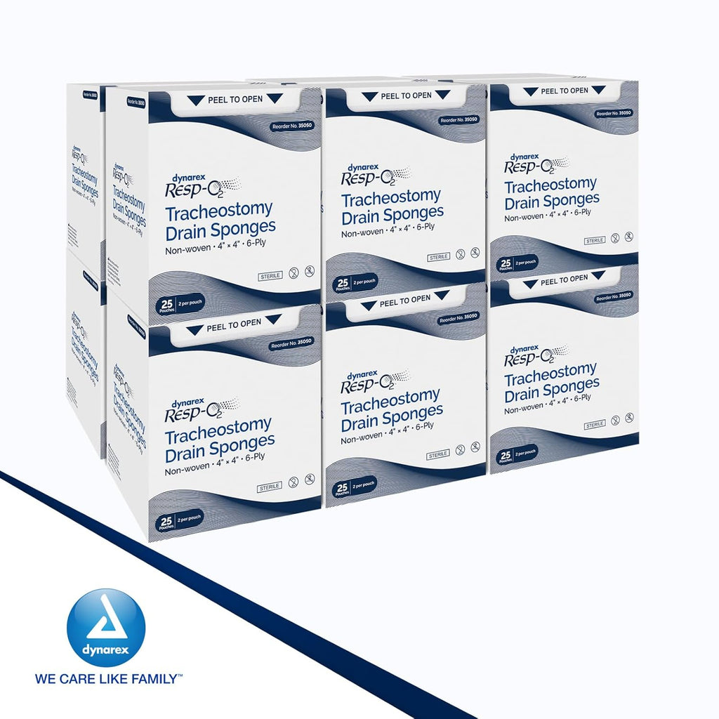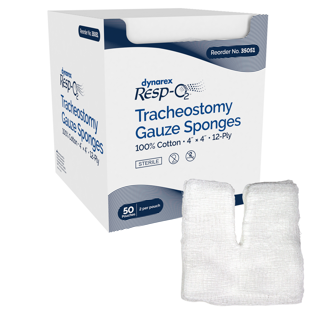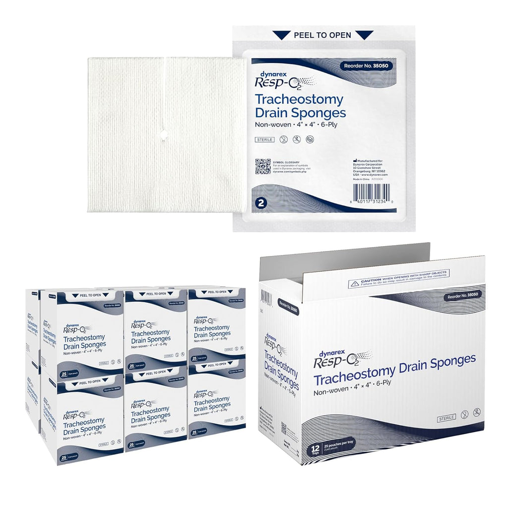 Dynarex Resp-O2™ Tracheostomy Drain Sponges are premium-quality sterile dressings designed with a convenient pre-cut T-shaped notch for a comfortable fit around drains, catheters, chest tubes, IVs, and trach tubes. These reliable, highly absorbent pads are designed to help keep patients dry and comfortable.