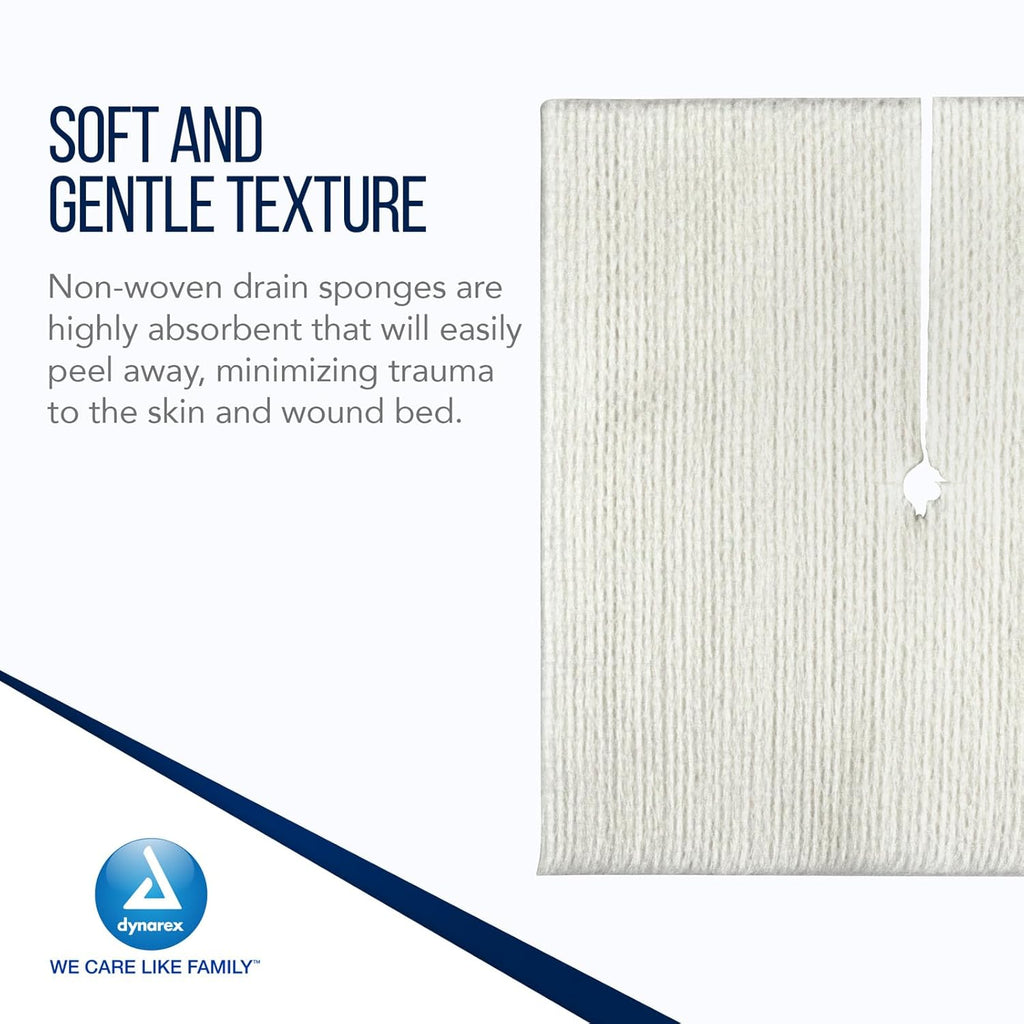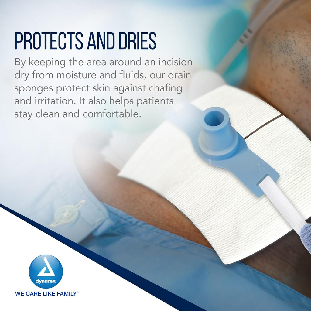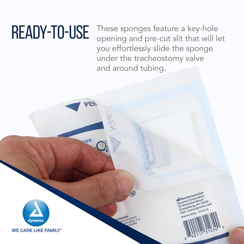 Dynarex Resp-O2™ Tracheostomy Drain Sponges are premium-quality sterile dressings designed with a convenient pre-cut T-shaped notch for a comfortable fit around drains, catheters, chest tubes, IVs, and trach tubes. These reliable, highly absorbent pads are designed to help keep patients dry and comfortable.