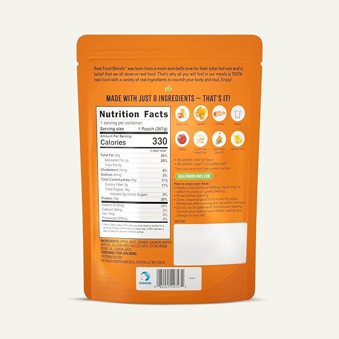Answer: Tube Feeding Formula Real Food Blends Salmon / Oats / Squash Flavor Liquid 9.4 oz. Pouch is an enteral nutrition formula for tube feeding as described in the product details.