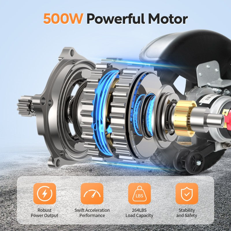 The tyres have passed tens of thousands of wear tests. The 360° rotating PU front wheel makes it easier for you to turn. 60 cm wear-resistant rear wheels have excellent shock absorption and non-slip properties. You can easily cross uneven terrain and remain stable on smooth surfaces.