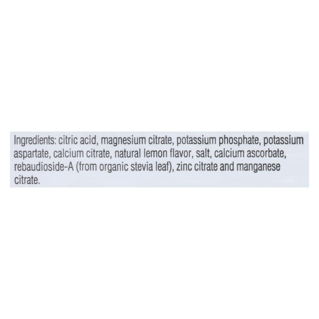 ingredients : citric acid;magnesium citrate;potassium phosphate;potassium aspartate;calcium citrate;natural lemon flavor;salt;calcium ascorbate;rebaudioside-a;from organic stevia leaf;zinc citrate and manganese citrate