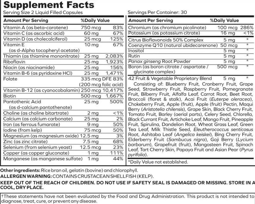 ☑️ This comprehensive supplement contains a 42-fruit and vegetable blend in convenient liquid capsules for optimal absorption.