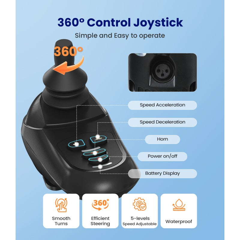 Equipped with dual 250W powerful motors and dual 24V /10AH batteries, the V62 wheelchair has an extended range of 12.5 miles on a single charge. The maximum Incline rating reaches 9 degrees, which meets a wider range of daily use needs.