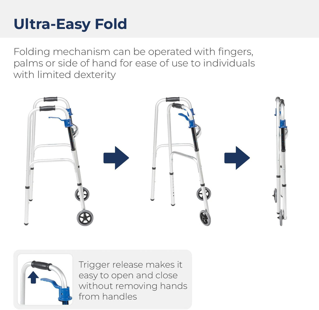 Answer: Most walkers fold flat using side buttons or levers. Check the overall width when open and folded. Compare with your doorway and storage space measurements listed under Specifications.