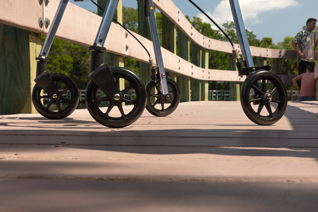 The rollator features four 6-inch wheels with locking brakes, giving users smooth mobility while maintaining control on a variety of surfaces. The locking brakes provide additional safety when stationary, making it ideal for resting, standing, or adjusting positioning. Adjustable handles with a height range of 33"–36" allow the rollator to fit a variety of users comfortably, promoting good posture and reducing strain during movement.